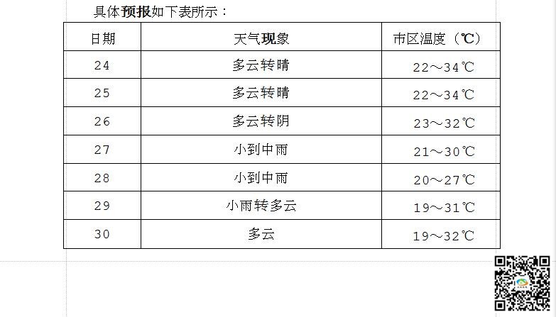 預(yù)計(jì)24-26日,受西太平洋副熱帶高壓的影響,天氣以多云為主,27-29日受北方下滑冷空氣影響,我市將有一次降水天氣過程,日最高溫度27~31℃,晴熱高溫天氣將明顯得到緩解。