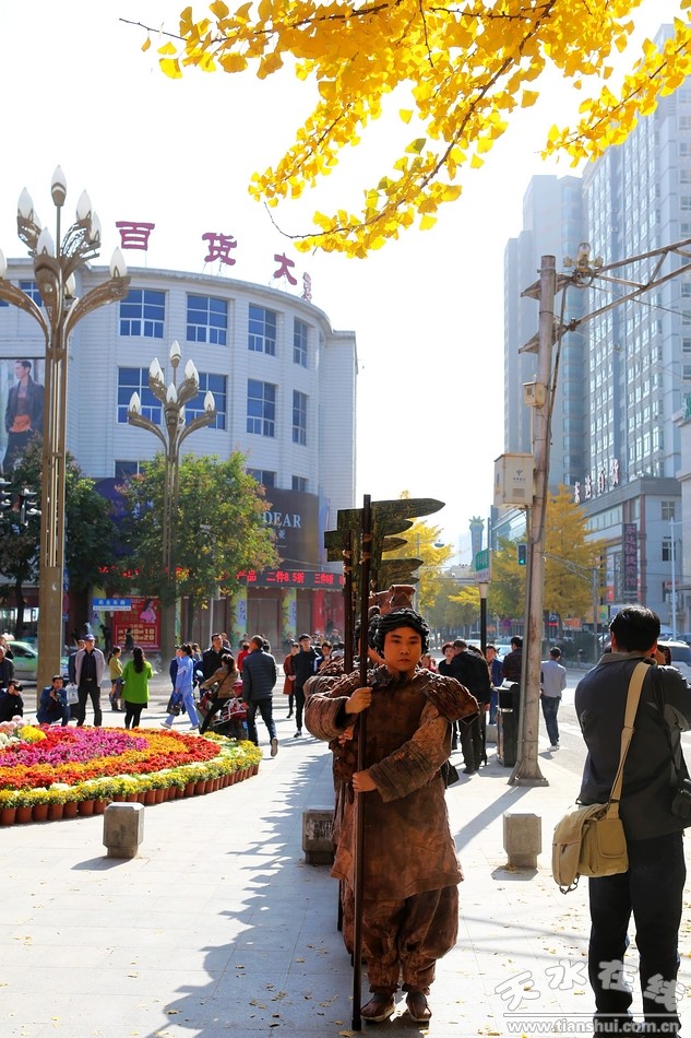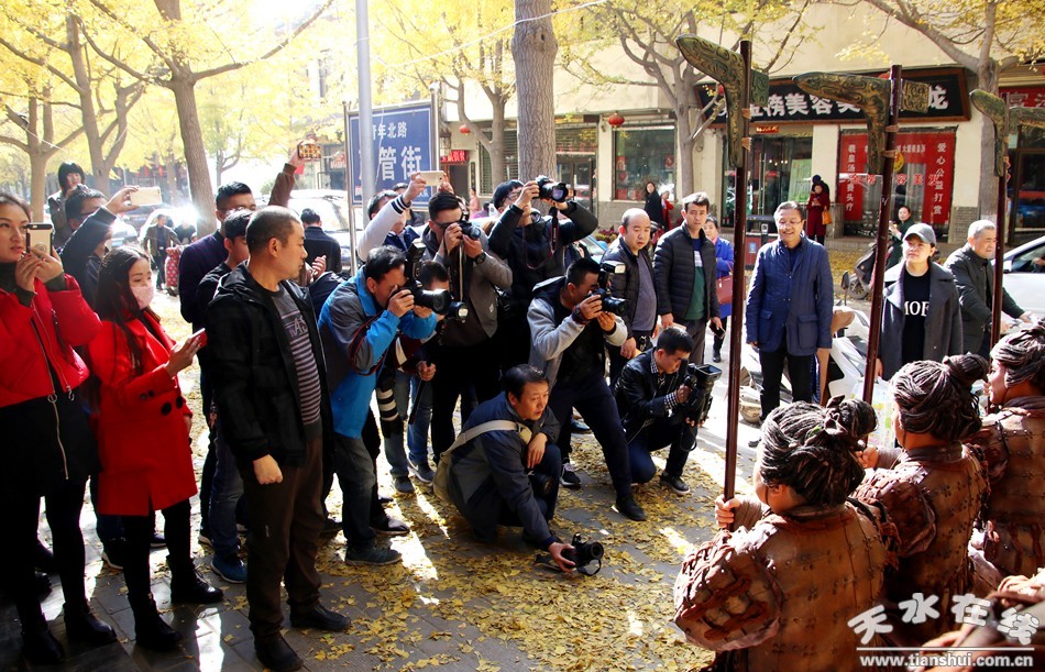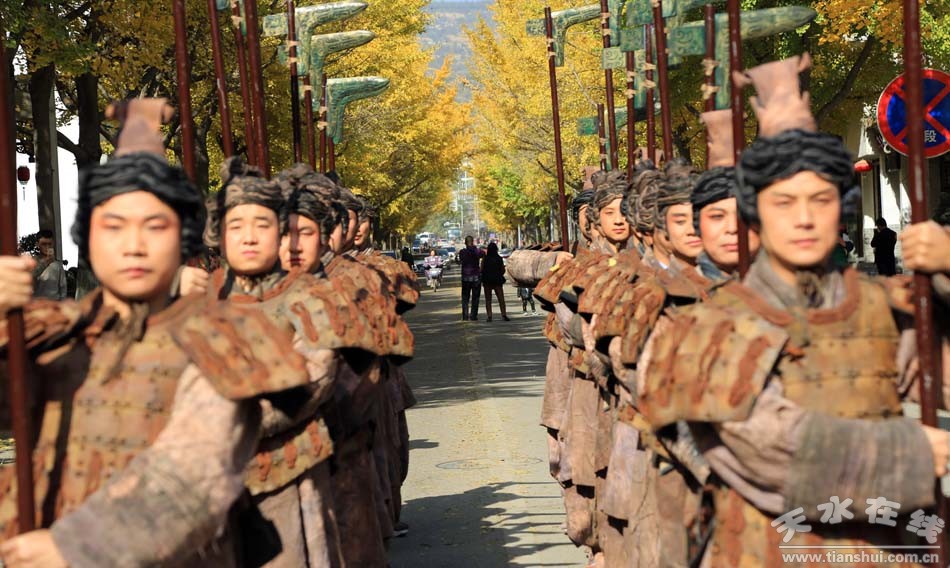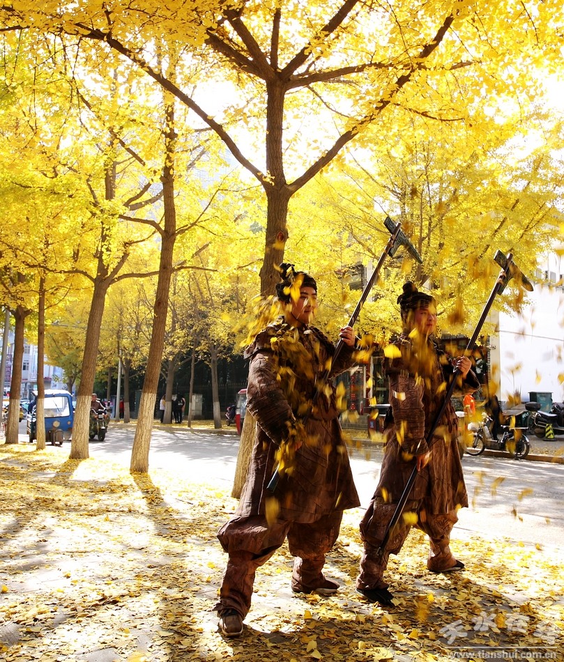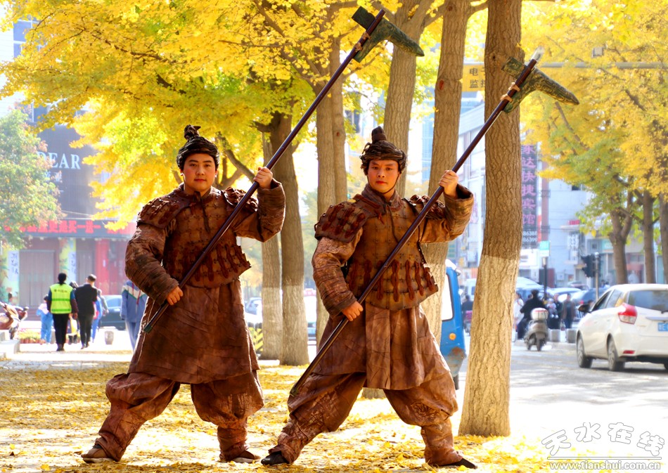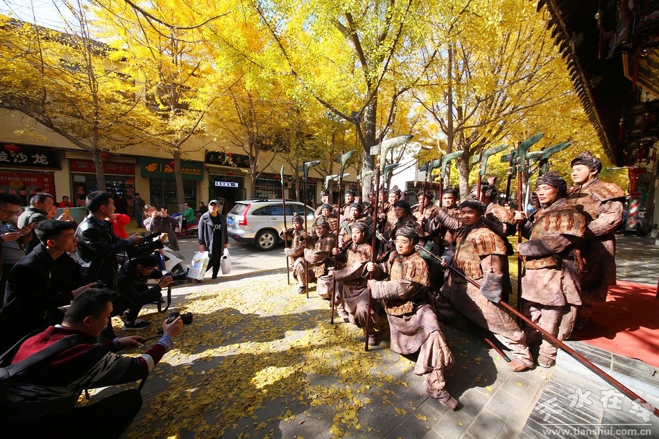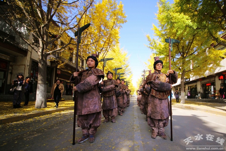 當(dāng)日的青年北路上,秦勇士“虎式”、“狼奔”的威武氣勢(shì),惹得天水市民頻頻駐足圍觀,賞銀杏,拍秦勇,回味“大秦帝國(guó)”的輝煌。以秦人發(fā)祥地天水為背景,講述秦先祖富國(guó)強(qiáng)兵悲壯歷程的《大秦文公》的“大秦勇士”,在銀杏“黃袍加身”之季走上街頭,與天水美景古韻共同代言天水秦文化,引發(fā)市民共鳴。