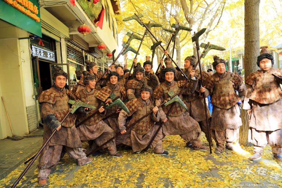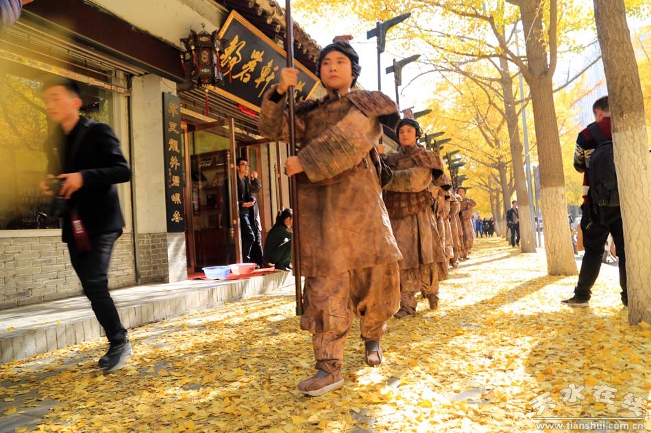 天水在線報(bào)道 銀杏落葉黃金滿地,“大秦勇士”威武出征。11月7日,“立冬”日,從天水市秦劇團(tuán)原創(chuàng)歷史秦腔劇《大秦文公》中走出來(lái)的20名“大秦勇士”,身披鎧甲,手執(zhí)金戈,“出征”天水青年北路,上演滿城盡帶黃金甲。
