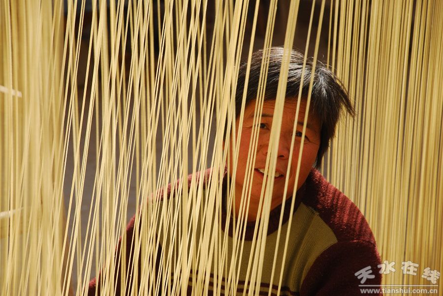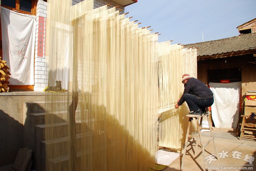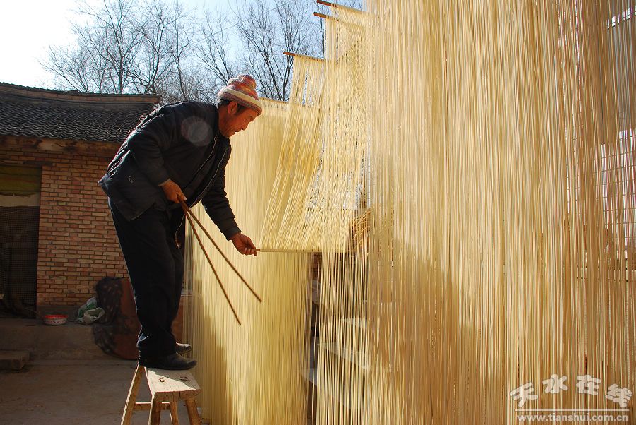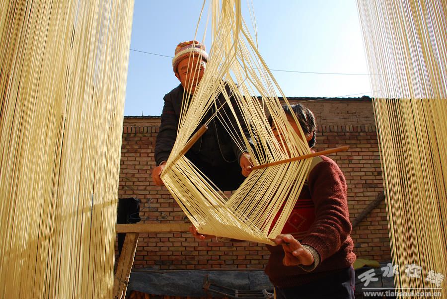 每年12月份左右,在天水市麥積區(qū)甘泉鎮(zhèn)廖家莊、石佛鎮(zhèn)黃家莊地部分農戶院里,你都可以看到掛涼在門字型架桿上長長地細圓桿面條,這種由家中男人們手工近三天時間制作出風味獨特的面條——便就是天水傳統(tǒng)手工掛面。