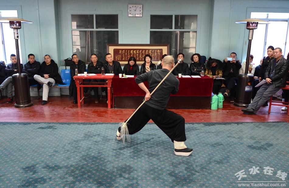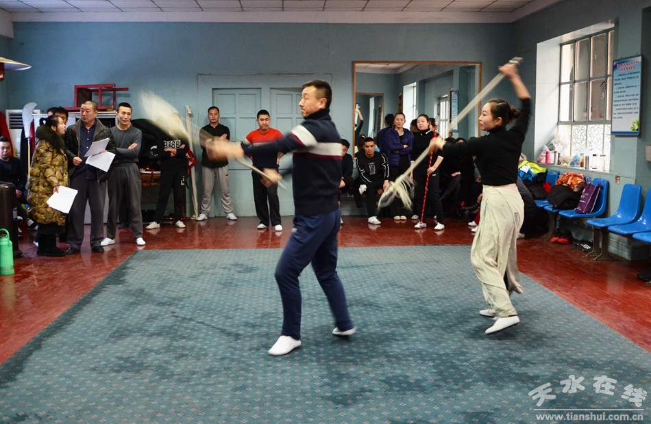 為推動秦腔發(fā)展,提高全體人員專業(yè)水平,此次匯報考核在天水市文化和旅游局副局長楊春曉組織帶領(lǐng)下,市西秦腔研究院副院長常小紅、袁丫丫、孟滿印及市文化和旅游局相關(guān)業(yè)務(wù)科室科長作為評委參加了此次考核?己瞬扇∪汗_觀摩,評委打分,綜合考評的形式進行,要求業(yè)務(wù)人員結(jié)合自身行當現(xiàn)場演出?己藘(nèi)容包括身段、腿功、毯子功、把子功,唱、念、做、打綜合片段,領(lǐng)奏司鼓、伴奏隨奏。
