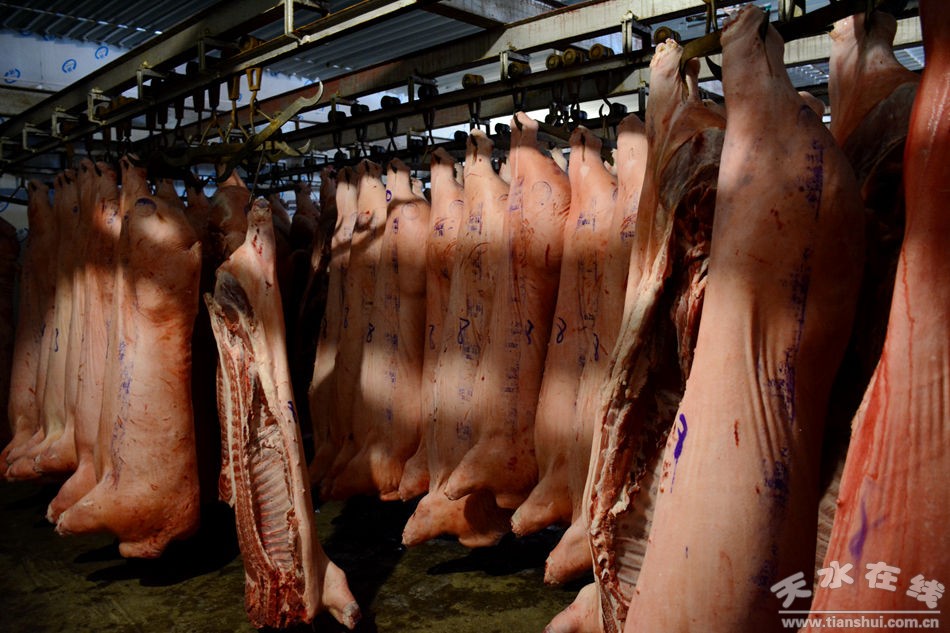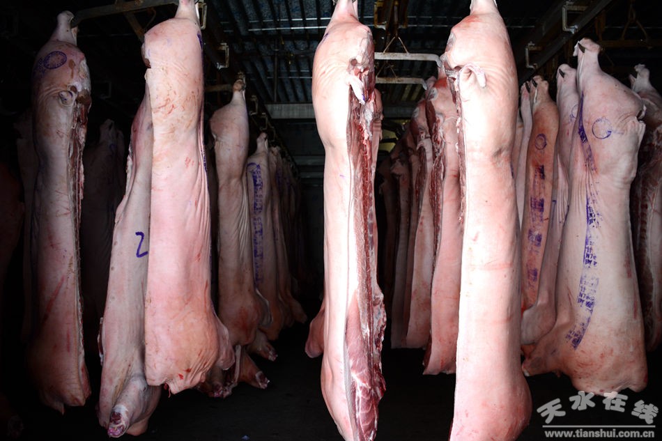 隨后記者來到天水益康肉品有限公司定點屠宰場,同時也是我市市區(qū)兩級今年淡季肉食的儲備投放庫,兩個倉庫中大約儲存了有200噸大肉,以滿足在過年期間市民的生活需求。