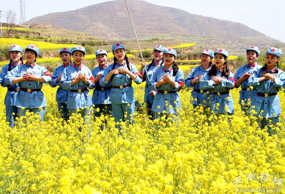 當日的龍臺鎮(zhèn)大莊村,油菜花田為舞臺,山川大地為背景,藝術家們用歌聲贊美山川,歌頌大地的主人。旋鼓舞表演鏗鏘有力,琵琶、古箏要把最美的高山流水之音彈奏給大地聽,情歌對唱抒發(fā)我們最真摯的內心情感,武術表演生龍活虎,葫蘆絲把“友誼地久天長”演繹的淋漓盡致,而英姿颯爽的“紅色娘子軍們”用歌聲贊美祖國的大好山河。 (從1935年9月至1936年10月,紅一、二、四方面軍主力部隊先后三次經過武山縣。)如微風吹過的田野,油菜花逐浪排開,表演精彩紛呈激情澎湃。由武山縣委宣傳部和天水在線策劃的《在希望的田野上》“快閃”更是把整個演出活動推向了高潮,驚艷了大地。油菜花田和藝術元素的完美結合,集中展現了武山縣脫貧攻堅、精神文明、生態(tài)建設、全域旅游、美麗鄉(xiāng)村建設的巨大成就。