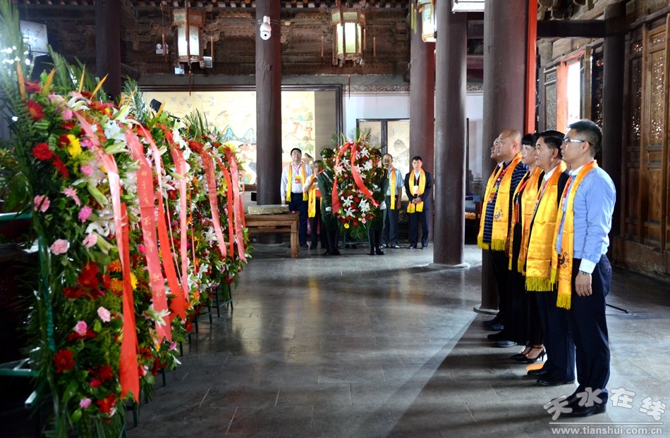 (全國政協(xié)常委、中國道教協(xié)會原會長任法融,澳門佛教(國際)聯(lián)合會會長釋戒晟,法門寺堂主釋洪利,十三屆全國政協(xié)常委、甘肅省政協(xié)原副主席、原伏羲文化研究會執(zhí)行會長周宜興,甘肅省政協(xié)原黨組副書記、副主席、原中華伏羲文化研究會會長張津梁,甘肅省軍區(qū)原副政委少將楊耀春,甘肅省伏羲文化研究會副理事長郝洪濤,廣東省深圳市政協(xié)原副秘書長張國英,原中華伏羲文化研究會副會長張向陽,清華大學(xué)歷史系教授、博士生導(dǎo)師廖名春敬獻花籃。)