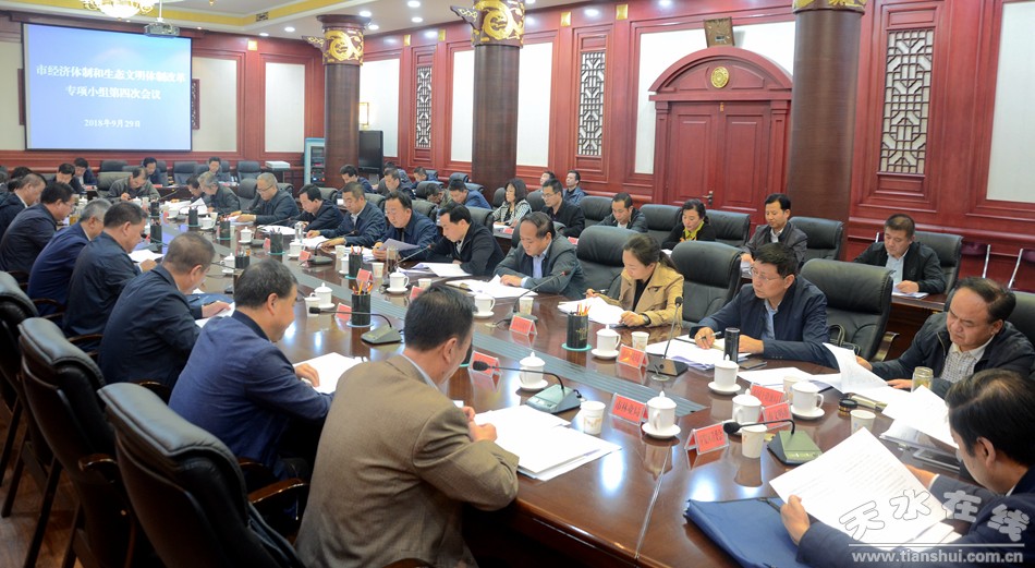9月29日,天水市委常委、常務(wù)副市長趙四輩主持召開市經(jīng)濟(jì)體制和生態(tài)文明體制改革專項小組第四次全體會議。傳達(dá)學(xué)習(xí)中央、省委、市委全面深化改革領(lǐng)導(dǎo)小組會議精神,通報我市經(jīng)濟(jì)體制和生態(tài)文明體制改革進(jìn)展情況,分析影響改革成效的突出問題,審議《關(guān)于深化交通投融資體制機制改革的實施意見》《加快推進(jìn)大規(guī)模國土綠化的實施意見》《關(guān)于深化國有企業(yè)改革的實施意見》,安排部署下一階段經(jīng)濟(jì)體制和生態(tài)文明體制改革的重點任務(wù)。