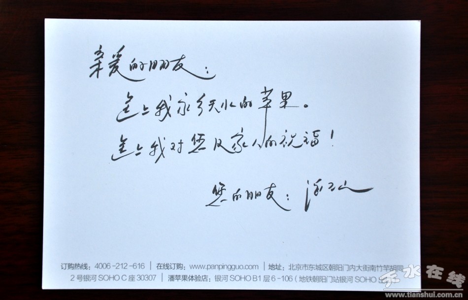 11月21日,天水在線收到了一件SOHO中國董事長潘石屹從北京寄來的禮品,一箱潘蘋果,一封信件。SOHO中國推廣部推廣主管告訴小編,這份禮品是潘總感謝天水在線一直以來給予SOHO中國和他本人宣傳報(bào)道的一點(diǎn)心意;希望以后雙方加強(qiáng)合作,共同把潘總致力于家鄉(xiāng)的公益事業(yè)宣傳好報(bào)道好。