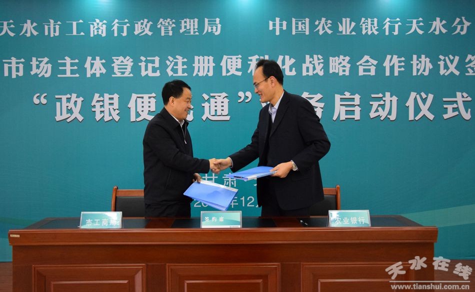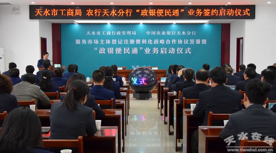 為深入貫徹中央和省、市“放管服”改革部署,進(jìn)一步推進(jìn)工商登記注冊(cè)便利化,更好地服務(wù)大眾創(chuàng)業(yè)、萬(wàn)眾創(chuàng)新,12月28日,市工商局、農(nóng)行天水分行舉行服務(wù)市場(chǎng)主體登記注冊(cè)便利化戰(zhàn)略合作協(xié)議簽署暨“政銀便民通”業(yè)務(wù)簽約啟動(dòng)儀式。副市長(zhǎng)王燕出席儀式并宣布業(yè)務(wù)啟動(dòng)。