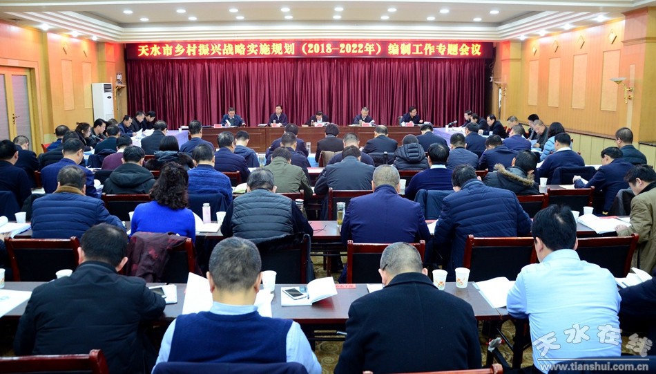 12月29日,天水市委、市政府召開《天水市鄉(xiāng)村振興戰(zhàn)略實施規(guī)劃(2018-2022年)》(送審稿)編制工作專題會議,征求各方對規(guī)劃編制的意見建議,加快推進我市鄉(xiāng)村振興戰(zhàn)略規(guī)劃編制工作。市委副書記趙衛(wèi)東要求,各縣區(qū)、各部門要充分認(rèn)識編制規(guī)劃的重要性,切實增強責(zé)任感,進一步統(tǒng)一思想,提高政治站位,把高質(zhì)量完成規(guī)劃編制工作作為落實市委、市政府實施鄉(xiāng)村振興戰(zhàn)略決策部署的具體行動。