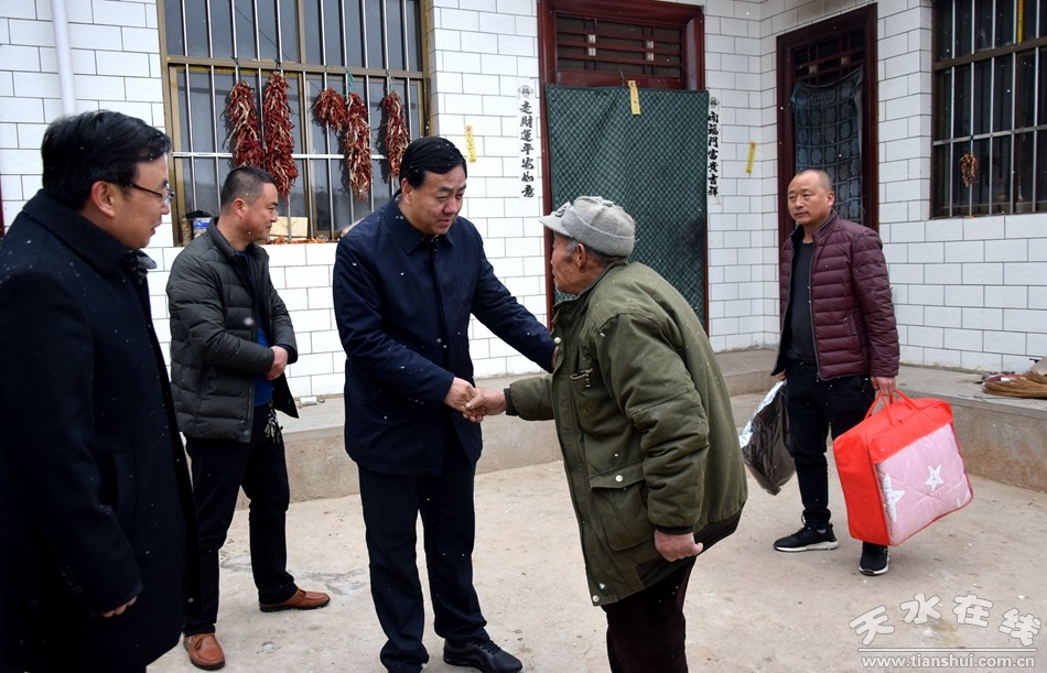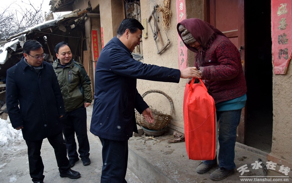 2018年12月30日,天水市副市長逯克宗帶領市扶貧辦、市農(nóng)業(yè)局負責人赴幫扶聯(lián)系點麥積區(qū)渭南鎮(zhèn)西湖灣村開展送溫暖活動,與鎮(zhèn)村干部座談交流,共商脫貧攻堅工作,走訪慰問五保戶、低保戶、貧困戶,為他們送去黨和政府的關懷與溫暖,向他們致以新年的問候和祝福。市政府副秘書長邵宏偉、麥積區(qū)副區(qū)長王啟峰參加走訪慰問活動。