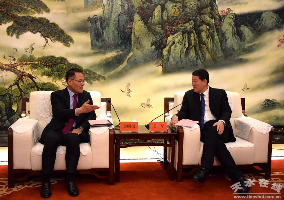 王軍代表市委、市政府和天水人民對(duì)金柄權(quán)一行的到來(lái)表示歡迎,并簡(jiǎn)要介紹了天水基本情況。他說(shuō),習(xí)近平總書(shū)記參加甘肅代表團(tuán)審議并發(fā)表重要講話,充分體現(xiàn)了對(duì)甘肅發(fā)展和脫貧攻堅(jiān)工作的高度重視和殷切期望,體現(xiàn)了對(duì)甘肅廣大干部群眾的關(guān)心關(guān)懷和深情牽掛,給我省我市廣大干部群眾以巨大鼓舞和強(qiáng)大動(dòng)力。天水是中華民族和中華文明的重要發(fā)祥地,也是絲綢之路沿線國(guó)家和地區(qū)文化交流、經(jīng)貿(mào)往來(lái)的重要節(jié)點(diǎn)城市,歷史悠久、文化底蘊(yùn)深厚、旅游資源豐富,極具發(fā)展?jié)摿,特別是每年舉行的公祭中華人文始祖伏羲大典,進(jìn)一步增強(qiáng)了民族凝聚力和天水知名度。中韓地緣相近、人文相通,各領(lǐng)域友好交流合作日益深入。天水與韓國(guó)在文化旅游、裝備制造、電子科技等領(lǐng)域具有廣闊的合作空間,希望韓國(guó)駐西安總領(lǐng)事館充分發(fā)揮橋梁紐帶作用,把韓國(guó)好的發(fā)展理念和方式帶到天水來(lái),加強(qiáng)溝通聯(lián)系,促進(jìn)各領(lǐng)域務(wù)實(shí)合作不斷取得新成效。