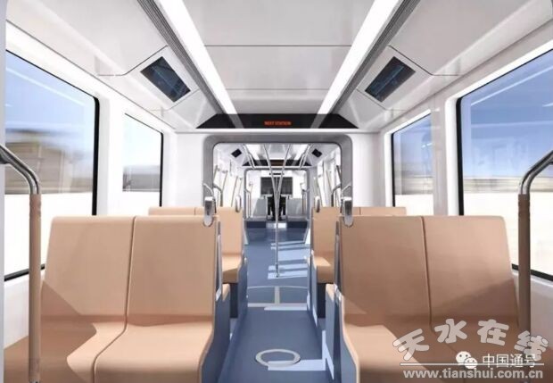 車輛走行部為鋼輪鋼軌制式,由五節(jié)車廂組成,時(shí)速可達(dá)70公里/小時(shí)。車身內(nèi)部共有座位58個(gè),載客量370人左右,主要色調(diào)為咖啡色與橘紅色,代表著天水人民純潔、質(zhì)樸的內(nèi)心,車內(nèi)裝飾提取了天水古建筑的各種元素,簡(jiǎn)約大方中透著典雅,豐富了空間肌理,增加了視覺層次。