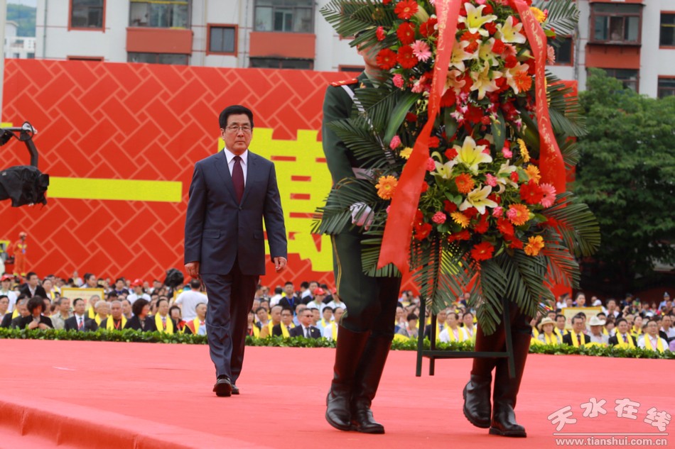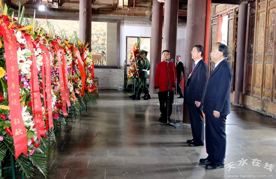 。ǜ拭C省政協(xié)副主席、中共天水市委書(shū)記王銳,天水市人大常委會(huì)主任蔣曉強(qiáng),中共天水市委副書(shū)記、市長(zhǎng)王軍,天水市政協(xié)主席張明泰,天水市軍分區(qū)政委石明敬獻(xiàn)花籃。)
