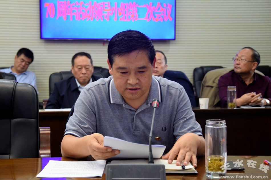 9月12日,天水市慶祝中華人民共和國成立70周年活動(dòng)領(lǐng)導(dǎo)小組召開第二次會(huì)議。市委副書記趙衛(wèi)東主持會(huì)議并強(qiáng)調(diào),各相關(guān)部門和單位要進(jìn)一步提振精神,鼓足干勁,完善方案,精心部署,狠抓落實(shí),確保慶祝中華人民共和國成立70周年活動(dòng)隆重、熱烈、有序、圓滿、成功舉辦。