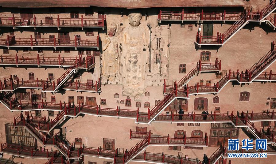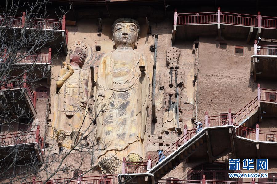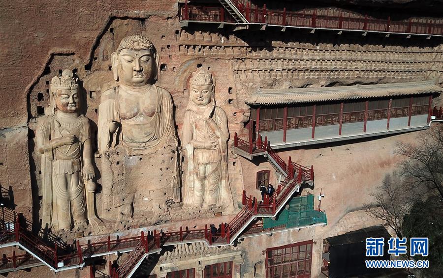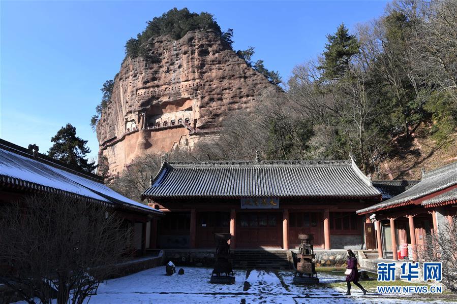 12月26日,游客在麥積山石窟參觀游覽。 一場降雪過后,位于甘肅省天水市的麥積山石窟在晴空下尤為壯美。麥積山石窟是中國四大石窟之一,因其山形似麥垛而得名,現(xiàn)存窟龕221座。 新華社記者 馬寧 攝