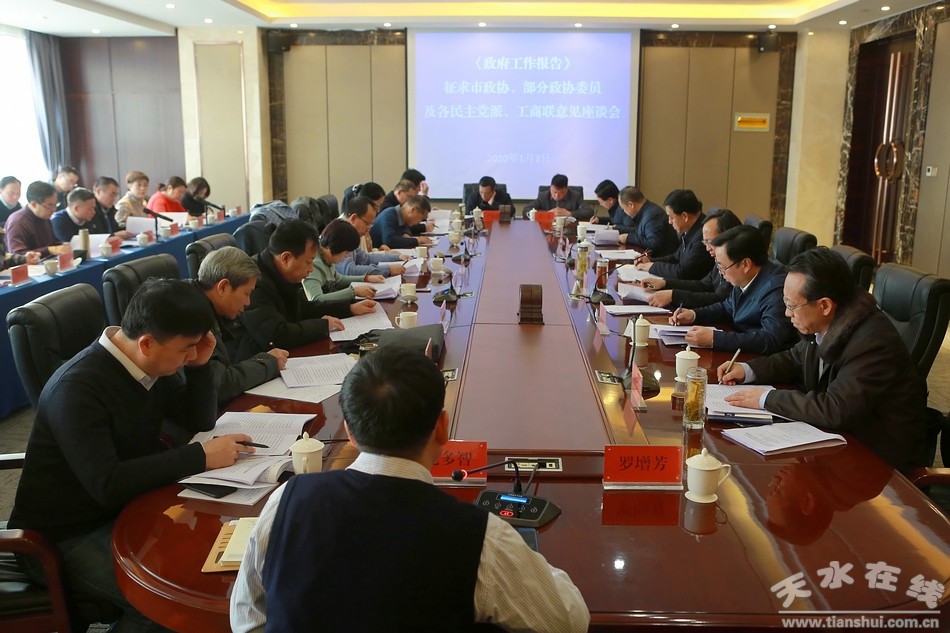 1月3日,天水市副市長逯克宗帶領(lǐng)市政府相關(guān)人員就2020年《政府工作報(bào)告》(征求意見稿)征求市政協(xié)、部分政協(xié)委員以及各民主黨派、工商聯(lián)的意見和建議。市政協(xié)黨組副書記、副主席王振宇,市政協(xié)副主席屈光平參加座談會。