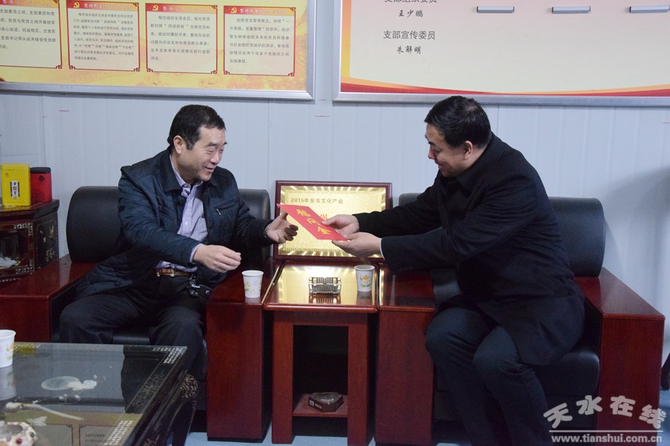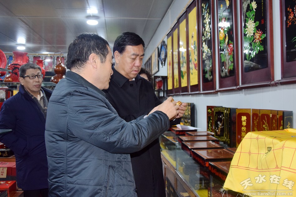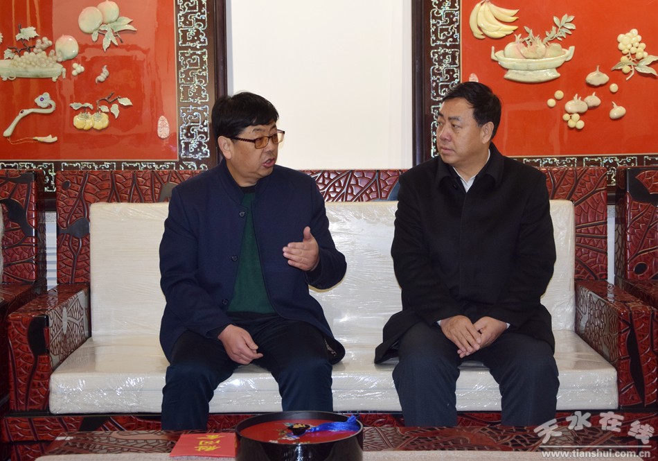 1月13日,天水市副市長逯克宗帶領市委組織部、市人社局負責人前往天水黃河雕漆工藝有限責任公司和天水飛天雕漆工藝家俱有限責任公司,看望慰問聯(lián)系的朱良軍、趙晨兩位專家,為他們送去新春的祝福