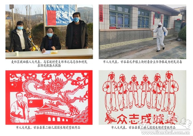 宣傳黨的政策、做好群眾思想工作是人大代表的一項(xiàng)重要職責(zé)。疫情防控期間婚事緩辦、喪事簡辦、不置辦酒席,做好群眾思想工作是關(guān)鍵。清水縣遠(yuǎn)門鎮(zhèn)人大主席杜彥奎得知幾戶村民準(zhǔn)備迎娶媳婦、操辦親屬祭日,他多次到幾戶村民家中走訪勸導(dǎo),講疫情防控形勢(shì),做思想工作,最終幾戶村民的婚禮延期、喪事簡辦,沒有發(fā)生操辦酒席、聚餐聚集問題。張家川縣張家川鎮(zhèn)人大代表、東街村黨支部副書記李義鴻,得知本村一戶湖北返鄉(xiāng)人員家庭買不到體溫計(jì)時(shí),及時(shí)將村委會(huì)備用的體溫計(jì)送到他們家中,叮囑他們居家隔離,并主動(dòng)為他們提供生活需求保障。麥積區(qū)琥珀鎮(zhèn)人大代表、馬家坡村黨支部書記馬志恒,在組織開展全村疫情防控工作時(shí),臥病在床的老父親突然去世,他強(qiáng)忍悲痛,毅然堅(jiān)守疫情防控一線,帶頭執(zhí)行喪事從簡規(guī)定要求,在村喇叭上謝絕所有村民和親戚上門吊唁,充分體現(xiàn)了人大代表的大局意識(shí)、責(zé)任意識(shí),為村民作出了表率、樹立了榜樣。市人大代表、甘谷縣禮辛鎮(zhèn)上街村委會(huì)主任李銀成主動(dòng)上門為村民院落進(jìn)行消毒、講解防疫知識(shí),市人大代表、甘谷縣第二幼兒園園長頡莉創(chuàng)作剪紙作品,為一線防疫工作人員加油鼓勁。
