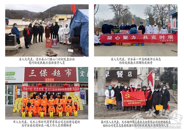 企業(yè)界人大代表,積極履行企業(yè)社會(huì)責(zé)任,展現(xiàn)了企業(yè)家敢于擔(dān)當(dāng)、樂于奉獻(xiàn)的良好精神風(fēng)貌。市人大代表、天水橋南家居建材城有限公司董事長趙金鳳捐助20萬元,并倡議天水橋南家居建材城、橋南服裝小商品城1271名員工捐助34.82萬元。市人大代表、天水永盛家電公司總經(jīng)理劉天泉對(duì)愛人麥積區(qū)人大代表王愛弟說:“咱們夫妻倆作為人大代表,在國家有難時(shí),要盡自己的一份微薄之力!狈蚱薅藶閵^戰(zhàn)在一線的醫(yī)護(hù)人員和值勤交警捐贈(zèng)了防護(hù)用品。市人大代表、武山縣醫(yī)藥公司副經(jīng)理邵春蓉向武山縣紅十字會(huì)捐贈(zèng)價(jià)值10萬元的防疫物資。市人大代表、天水永生集團(tuán)董事長張以諾為秦州區(qū)七個(gè)街道辦事處和玉泉鎮(zhèn)政府抗疫一線的黨員干部捐獻(xiàn)礦泉水、方便面等900多箱。市人大代表、甘谷縣騰達(dá)實(shí)業(yè)有限公司總經(jīng)理張維林向甘谷縣疫情監(jiān)測(cè)點(diǎn)捐贈(zèng)價(jià)值3.42萬元的防護(hù)用品。麥積區(qū)人大代表、天水麥積融興村鎮(zhèn)銀行行長張智東,研究推出六項(xiàng)金融措施,通過貸款重組、貸款展期、抵押增信等風(fēng)險(xiǎn)化解方式,助力小微企業(yè)復(fù)工復(fù)產(chǎn)。武山縣第四建筑公司總經(jīng)理?xiàng)罡s、金鑫商貿(mào)有限責(zé)任公司總經(jīng)理馬四武、東順建筑公司總經(jīng)理張春軍三名縣人大代表捐助40萬元。市人大代表、天水三保時(shí)代商貿(mào)有限公司總經(jīng)理馬愛玲為甘谷縣疫情防疫一線工作人員捐贈(zèng)3.5萬元的防護(hù)用品和生活用品。秦州區(qū)人大代表、天水楊師傅清真糕點(diǎn)坊有限公司經(jīng)理?xiàng)畛兄,組織公司黨員志愿者服務(wù)隊(duì),慰問石馬坪街道疫情防控工作人員,并送去60多份糕點(diǎn)。