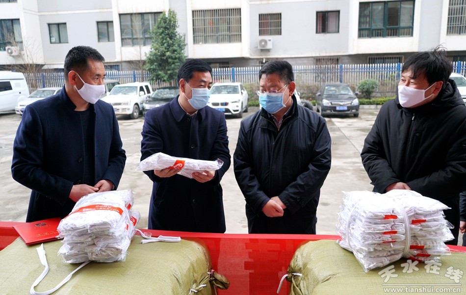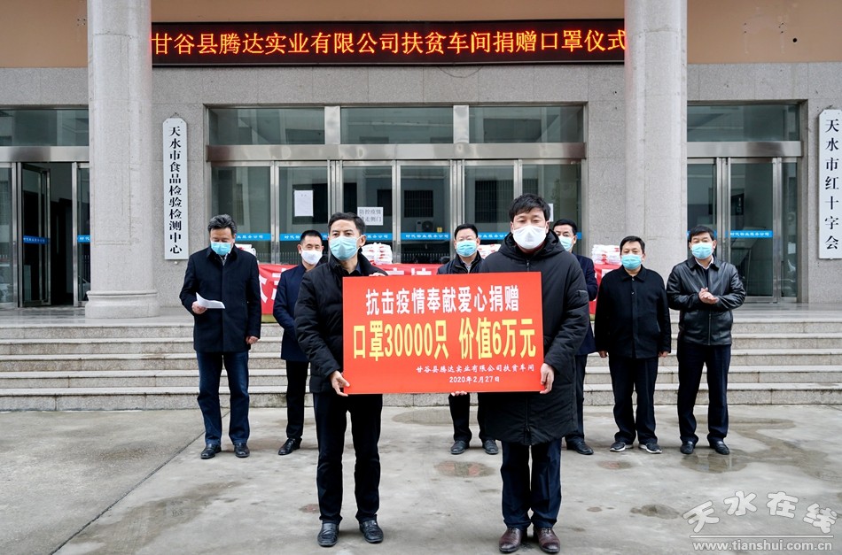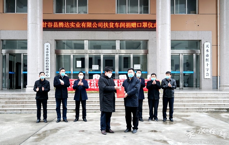 2月27日,甘谷縣騰達(dá)實業(yè)有限公司扶貧車間為我市捐贈30000只口罩,支援我市疫情防控工作。市委常委、宣傳部部長張建杰為捐贈方頒發(fā)捐贈證書,副市長逯克宗出席捐贈儀式。