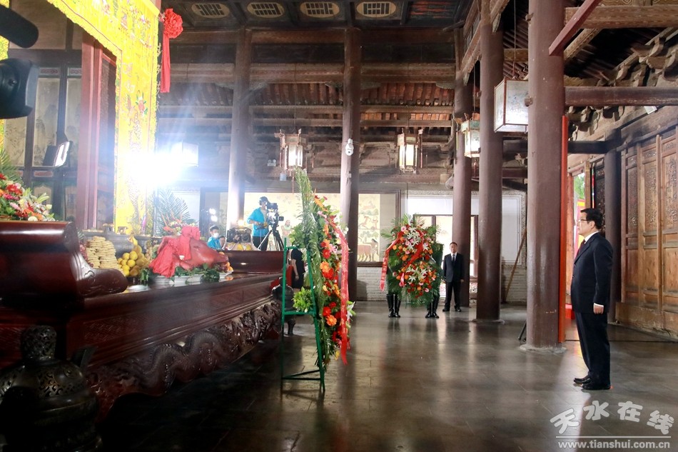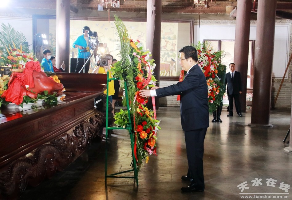 2020(庚子)年公祭中華人文始祖伏羲大典6月22日在天水隆重舉行。圖為中共甘肅省委書記、省人大常委會(huì)主任林鐸敬獻(xiàn)花籃。