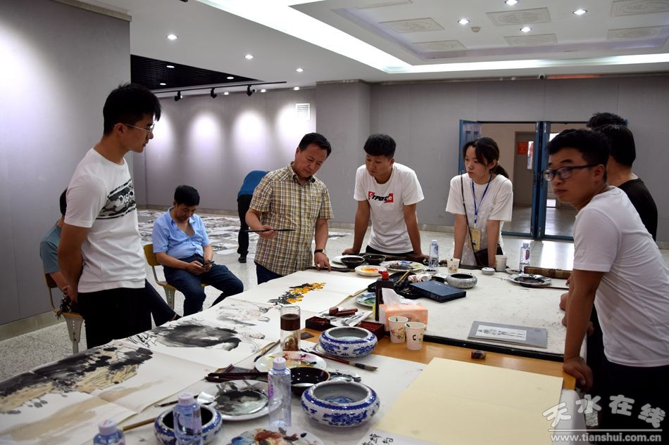 當(dāng)天下午,13位美術(shù)名家在天水師院美術(shù)館潑墨揮毫,進(jìn)行現(xiàn)場(chǎng)創(chuàng)作,天水師院美術(shù)學(xué)院的師生現(xiàn)場(chǎng)觀摩學(xué)習(xí)。這也是天水市美術(shù)家協(xié)會(huì)成立以來(lái)多次組織美術(shù)名家走進(jìn)高校,面對(duì)面和師生交流。