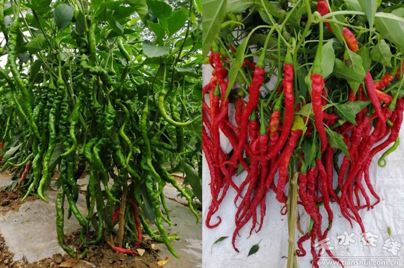 該品種保持了傳統(tǒng)甘谷辣椒的優(yōu)良品質(zhì),提高了抗病性、豐產(chǎn)性和抗旱性,在山旱地種植優(yōu)勢明顯。屬中熟品種,從定植到紅熟 90 天左右,株形緊湊,長勢強(qiáng),平均株高78.5cm,株幅62.3cm,始花節(jié)位12-14。單株結(jié)果 50個(gè)左右,結(jié)果較集中,果實(shí)線形,青熟果綠色,紅熟果深紅色,果面皺,果長26.5cm,果粗1.6cm,果肉厚0.18cm,單果質(zhì)量17.6g,畝產(chǎn)鮮椒3000公斤左右,畝產(chǎn)干椒400公斤左右,較傳統(tǒng)甘谷辣椒增產(chǎn)一倍以上,畝增收2000多元。
