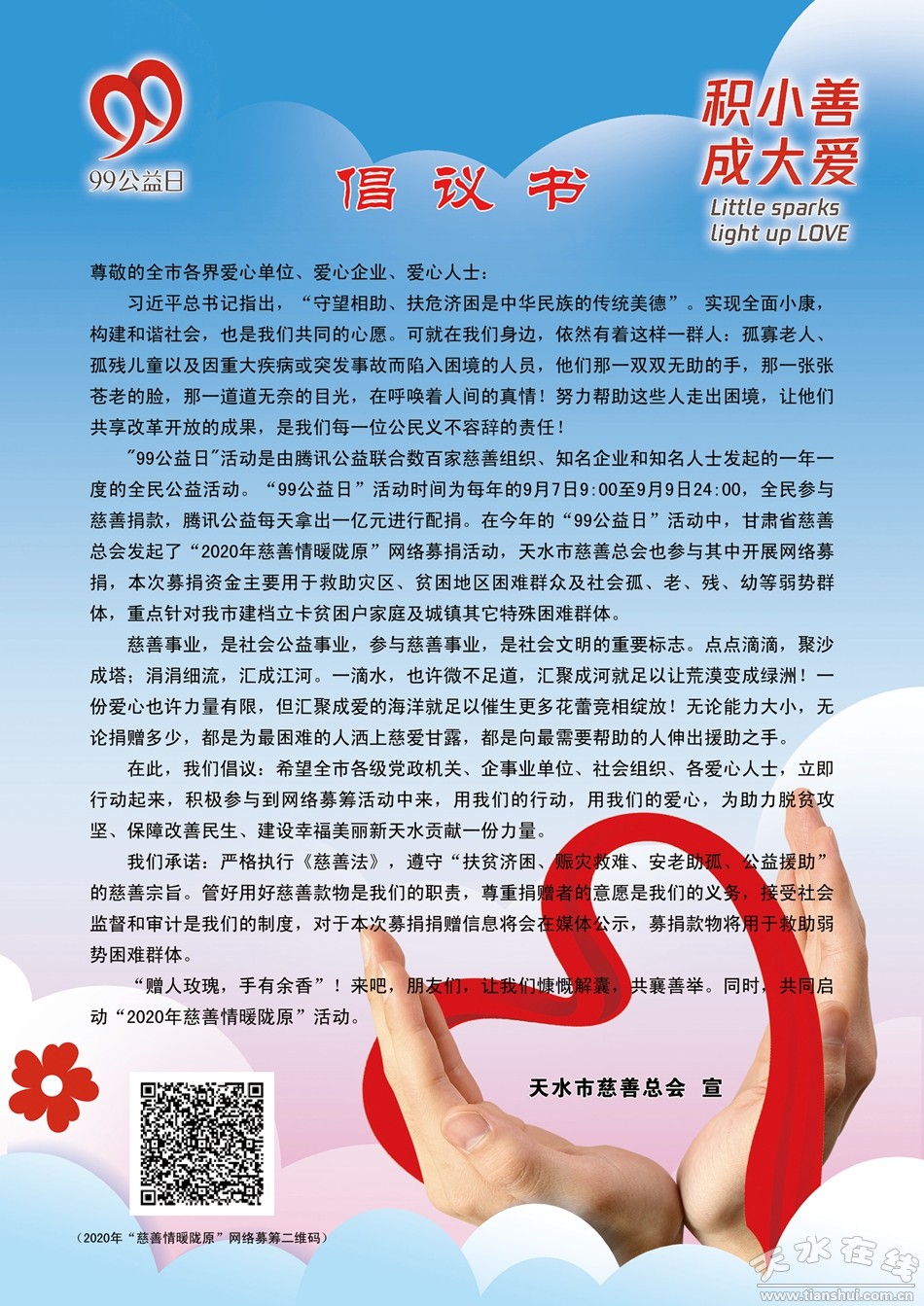 天水市慈善總會發(fā)布“99公益日”倡議書