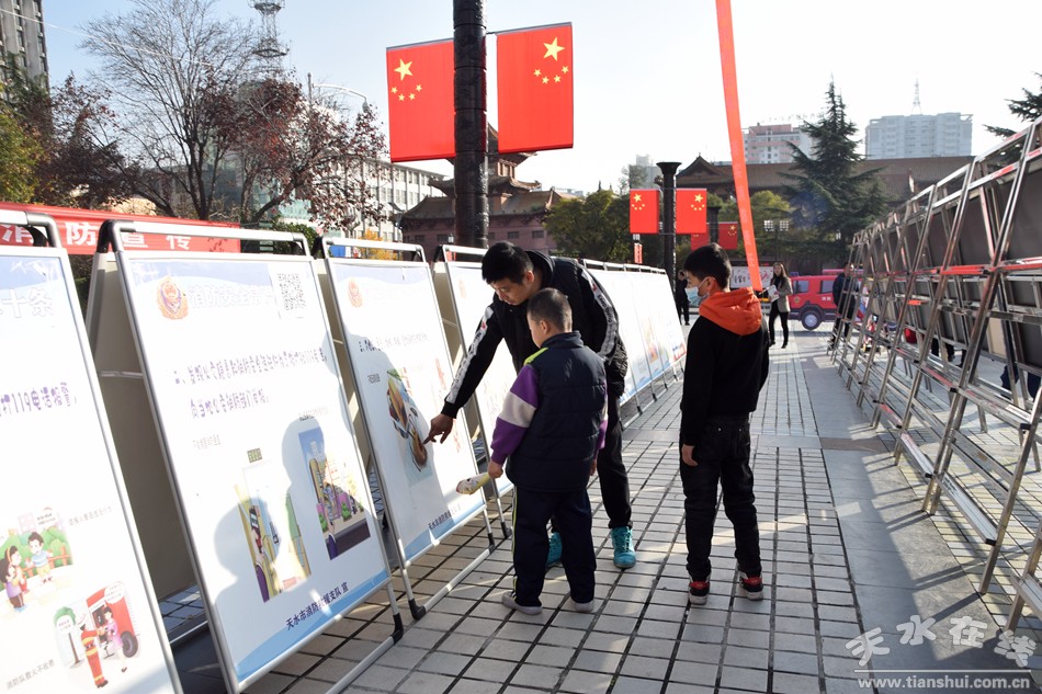 (天水在線主播、天水消防宣傳形象大使萌萌向市民發(fā)放宣傳材料)
