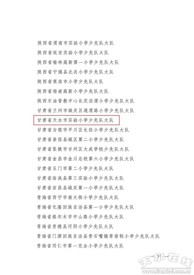 恭喜我市陳紫菱、樊家瑜兩名少先隊(duì)員榮獲“全國(guó)優(yōu)秀少先隊(duì)員”稱號(hào),天水市實(shí)驗(yàn)小學(xué)少先隊(duì)大隊(duì)、天水市清水縣西關(guān)小學(xué)五(3)中隊(duì)榮獲“全國(guó)優(yōu)秀少先隊(duì)集體”稱號(hào)。