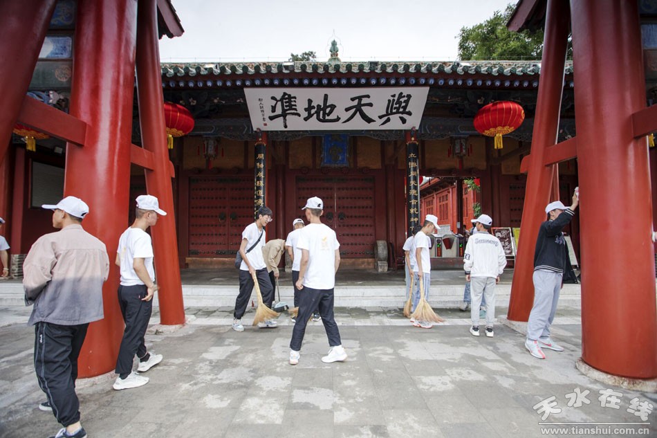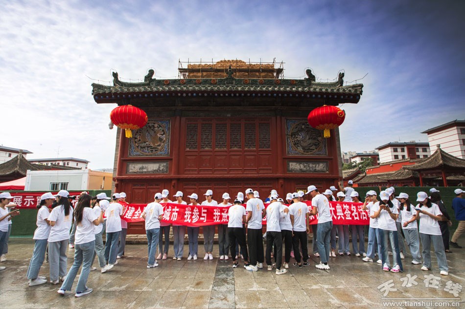 活動(dòng)上,由甘肅工業(yè)職業(yè)技術(shù)學(xué)院80名學(xué)生組成的志愿者服務(wù)隊(duì)進(jìn)行了現(xiàn)場(chǎng)簽名承諾。之后,志愿者們對(duì)伏羲城東西牌坊、廊庭、墻面進(jìn)行了徹底清掃。