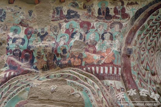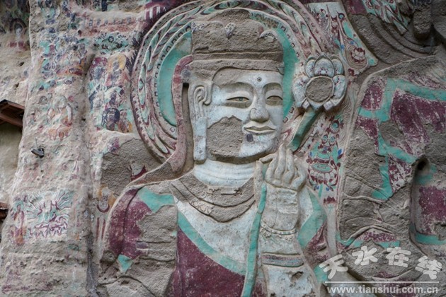 水簾洞石窟群摩崖浮雕造像上的壁畫(8月18日攝)。