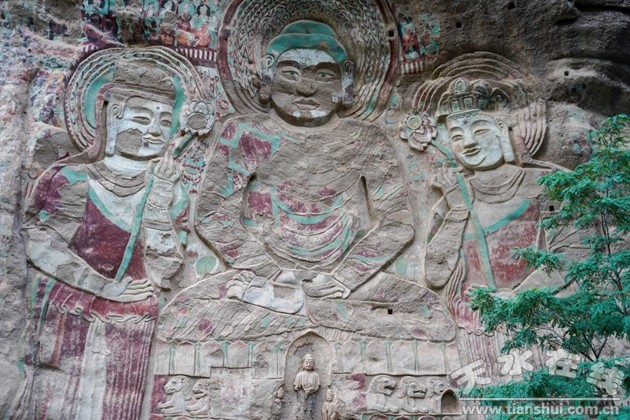 水簾洞石窟群位于甘肅省天水市武山縣城東北25公里處的魯班峽谷中,以高達(dá)42.3米的摩崖浮雕造像而著名。石窟群始建于十六國后秦時(shí)期,由水簾洞、拉梢寺、千佛洞、顯圣寺四個(gè)單元構(gòu)成,還保存有北魏以來的精美壁畫和彩塑。新華社記者 何問 攝