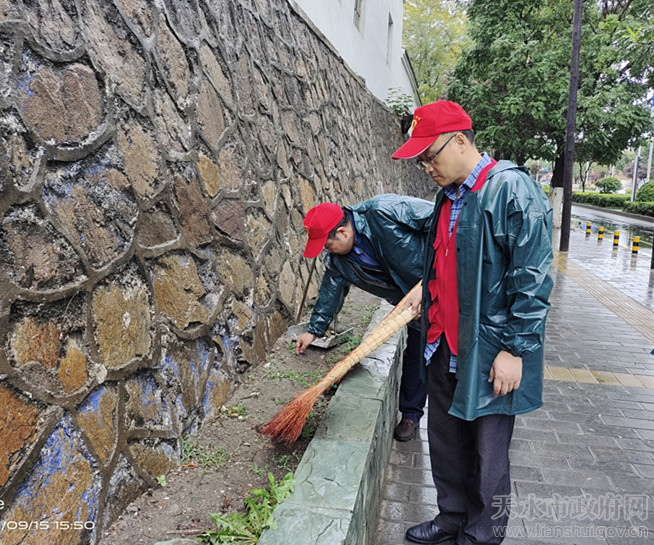 為助推我市“全國文明城市”創(chuàng)建工作,著力改善市容市貌,提升市民文明素質(zhì),確保創(chuàng)建指標(biāo)任務(wù)高效高質(zhì)完成。9月15日,在市市場監(jiān)管局統(tǒng)一安排下,天水市藥檢中心主任魯安明帶領(lǐng)10名志愿服務(wù)人員按照全市創(chuàng)建文明城市“衛(wèi)生好、秩序好、設(shè)施好、市容好、宣傳好、文明程度指數(shù)高”的“五好一高”標(biāo)準(zhǔn)要求,冒著大雨在“包街”路段開展志愿服務(wù),清理衛(wèi)生死角、整理亂放雜物、美化道路環(huán)境。