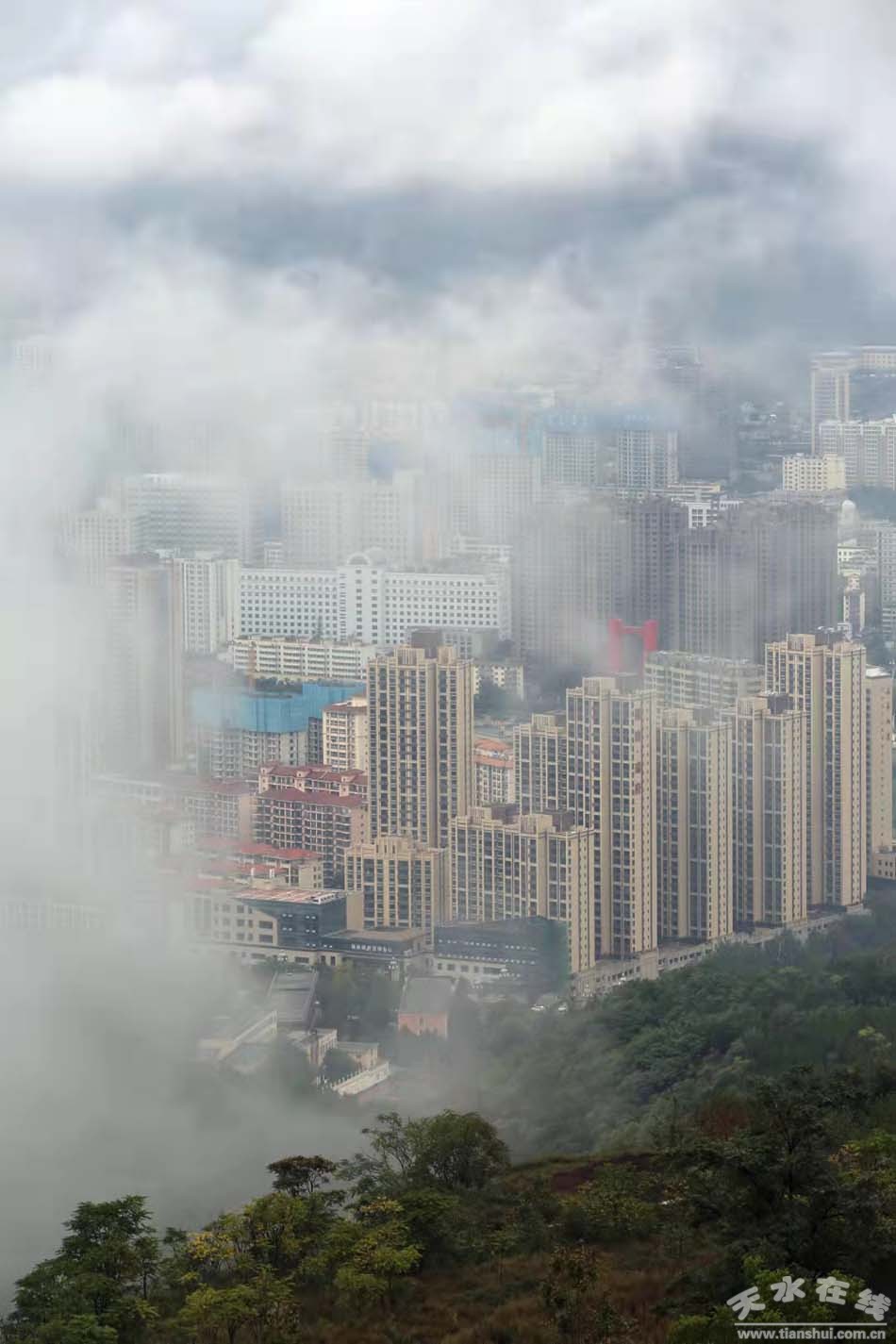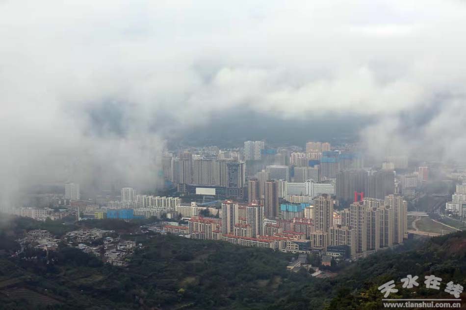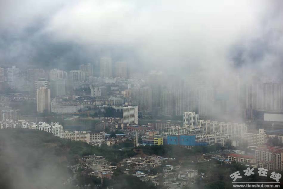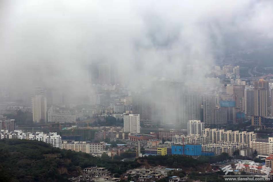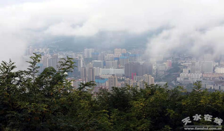 9月25日,天水城,大雨。站在南山俯瞰天水城,煙霧繚繞,宛若仙境。(攝影:楊彥東)