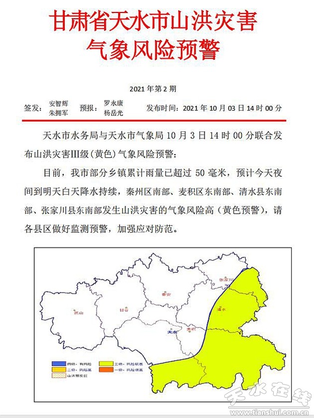 天水市發(fā)布山洪災(zāi)害Ⅲ級(jí)(黃色)氣象風(fēng)險(xiǎn)預(yù)警