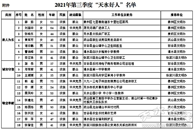 “天水好人”的評選由市文明辦牽頭,每季度評選一次。2021年第三季度,按照市文明辦《關(guān)于組織開展“天水好人”推薦評選活動的通知》,各縣區(qū)共推薦“助人為樂”“誠實守信”“敬業(yè)奉獻”“孝老愛親”四個類別“天水好人”候選人40人。市文明辦邀請市委宣傳部、市委直屬機關(guān)工委、市總工會、團市委、市婦聯(lián)、天水日報社、天水廣播電視臺等單位相關(guān)負責(zé)人組成評審委員會,于2021年9月29日召開會議進行了認(rèn)真評審,確定薛茹等22人為2021年第三季度“天水好人”(名單見附件)。