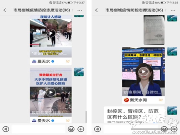 同時,通過微信群傳播市縣政策、資汛,宣傳天水防疫正能量感人事跡和小區(qū)好人好事,引導(dǎo)住戶理解配合支持防疫工作。