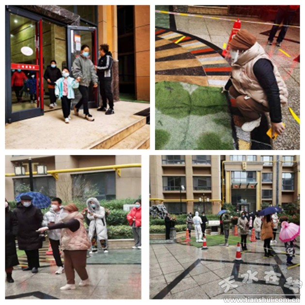 圖片3:臨時黨支部成員通過網(wǎng)格化管理,組織小區(qū)居民有序下樓;氣象局黨支部成員組織居民開展核酸檢測;居民黨支部志愿者在院子鋪好防滑墊;居民黨支部樓長在單元門口維持核酸檢測秩序。
