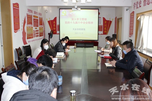 近日,天水市檔案館組織召開學習貫徹黨的十九屆六中全會精神會議,集中傳達學習中國共產黨第十九屆中央委員會第六次全體會議精神,并就學習宣傳和貫徹落實工作進行安排部署。黨支部書記、館長何忠蘭主持會議并講話,黨支部副書記盧芳傳達學習《中國共產黨第十九屆中央委員會第六次全體會議公報》。