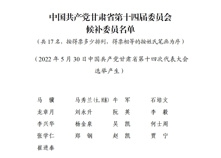 中國共產(chǎn)黨甘肅省第十四屆委員會委員名單