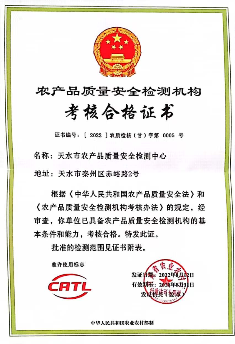 近日,天水市農(nóng)產(chǎn)品質(zhì)量安全檢測中心獲得了農(nóng)產(chǎn)品質(zhì)量安全檢測機構(gòu)考核合格證書,獲批可開展申報的3個類別 22個產(chǎn)品78個參數(shù)的農(nóng)殘檢測,這是我中心繼2020年通過省市場監(jiān)管局組織的檢驗檢測機構(gòu)資質(zhì)認定(CMA)后,又通過了省農(nóng)業(yè)農(nóng)村廳組織的農(nóng)產(chǎn)品質(zhì)量安全檢測機構(gòu)考核(CATL),成為今年全省武威、酒泉等市州之后第5家通過“雙認證”的農(nóng)產(chǎn)品質(zhì)量安全檢測機構(gòu)。