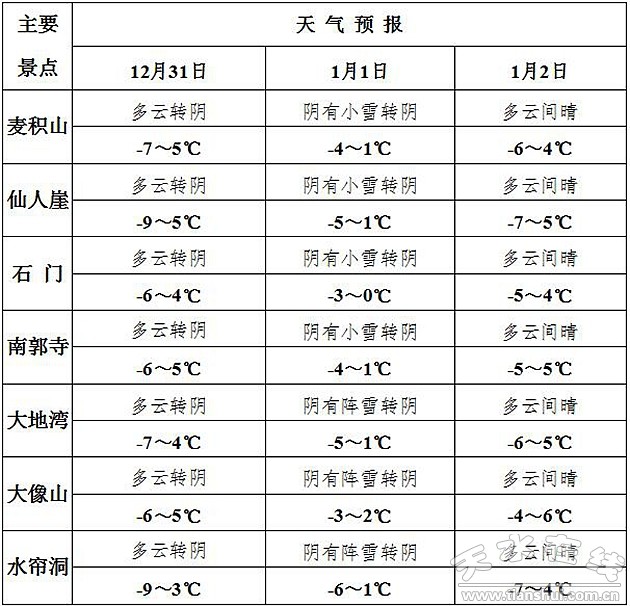 【摘要】預(yù)計(jì)“元旦”期間,我市天氣以陰為主,其中1日白天陰有小雪,日最低氣溫 -14℃~-6℃,日最高氣溫0℃~6℃。降雪天氣對交通運(yùn)輸有不利影響,需注意出行安全。