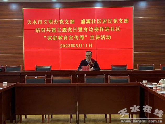 為深入開展“三抓三促”行動(dòng),扎實(shí)推進(jìn)基層黨建結(jié)對(duì)共建工作,5月11日上午,天水市文明辦黨支部以“結(jié)對(duì)共建共促發(fā)展榜樣引領(lǐng)涵養(yǎng)好家風(fēng)”為主題,與東關(guān)街道盛源社區(qū)居民黨支部聯(lián)合開展了結(jié)對(duì)共建5月份主題黨日暨身邊榜樣進(jìn)社區(qū)“家庭教育宣傳周”宣講活動(dòng)。市文明辦全體黨員、盛源社區(qū)居民黨支部黨員共32人參加了活動(dòng)。