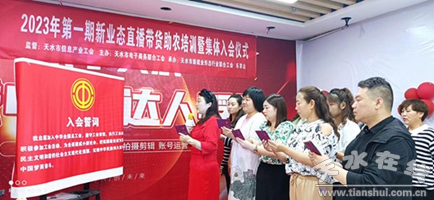 2023年6月17-18日,由天水市信息產(chǎn)業(yè)工會組織開展為期兩天的2023年第一期新業(yè)態(tài)直播帶貨助農(nóng)培訓(xùn)開班,開班培訓(xùn)前全體參訓(xùn)新業(yè)態(tài)直播帶貨從業(yè)人員認(rèn)真填寫工會入會表,大家熱情高漲,首批持證主播在現(xiàn)場頒證并在儀式活動上集體宣誓,20多位網(wǎng)絡(luò)帶貨主播在儀式上集中入會。