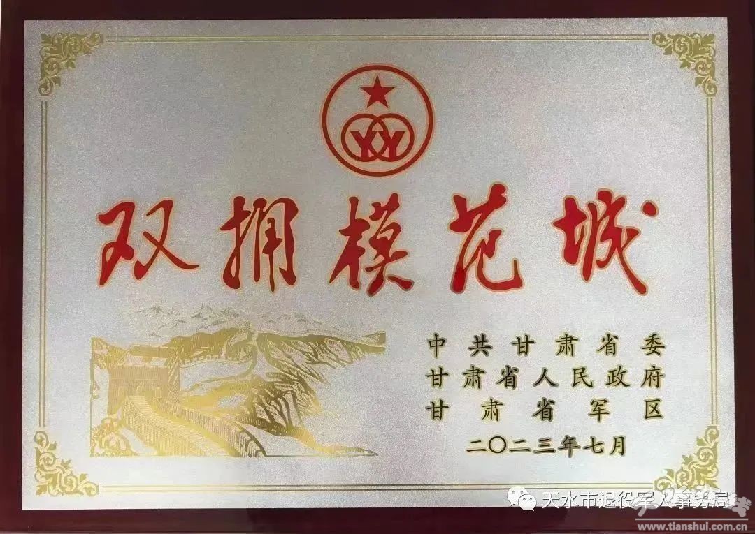 7月27日上午,甘肅省第十一屆雙擁模范城(縣)命名暨雙擁模范單位和個人表彰大會在蘭州隆重舉行。天水市及麥積區(qū)被中共甘肅省委、甘肅省人民政府、甘肅省軍區(qū)命名為“省級雙擁模范城”,秦安縣、清水縣、張家川縣被命名為“省級雙擁模范縣”,天水市財政局等5個單位被表彰為“甘肅省愛國擁軍模范單位”,96743部隊62分隊等2個單位被表彰為“甘肅省擁政愛民模范單位”,彭德川等6人被表彰為“甘肅省愛國擁軍模范個人”,俞江等3人被表彰為“甘肅省擁政愛民模范個人”。