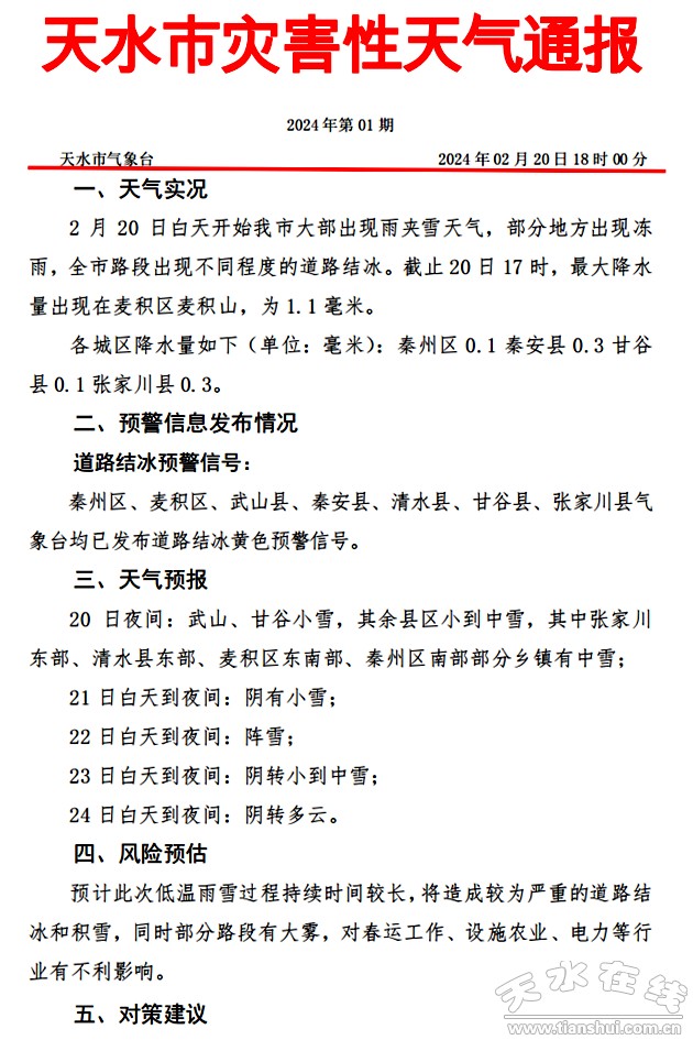 天水市災(zāi)害性天氣通報(2024年第01期)
