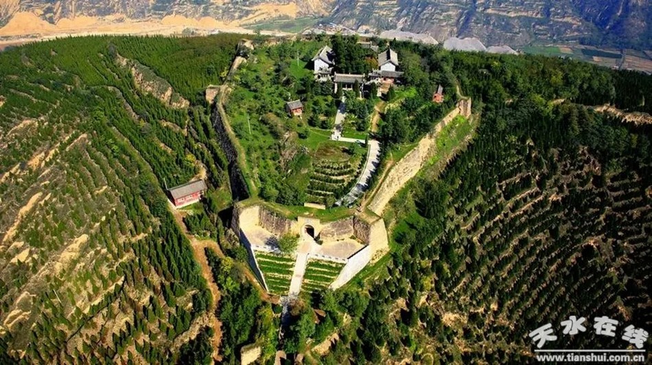 卦臺(tái)山簡(jiǎn)介:卦臺(tái)山又稱伏羲畫卦臺(tái),位于天水市麥積區(qū)渭南鎮(zhèn)西,是中華人文始祖伏羲觀天法地、演繹八卦、教化眾生之地,因此而得名。其山突兀而起,狀如倒扣之瓢,山頂為平臺(tái),海拔1363米,相對(duì)高度170米。北麓渭水環(huán)繞,河岸北正對(duì)九龍山,山下有龍馬洞,渭水中有分姓石(又稱分心石、龍石);南倚白鹿山,中呈峰腰,東臨三陽(yáng)川盆地,三陽(yáng)川在南北兩山環(huán)抱中,渭河呈“S”形,由西向東穿過(guò),如同一個(gè)真實(shí)的太極原圖。