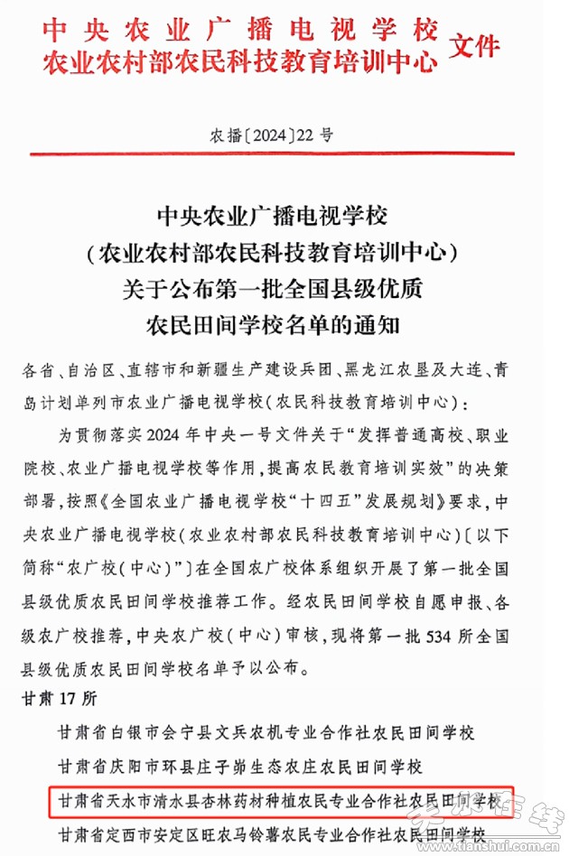 近日,中央農(nóng)業(yè)廣播電視學(xué)校(農(nóng)業(yè)農(nóng)村部農(nóng)民科技教育培訓(xùn)中心)公布了第一批全國(guó)縣級(jí)優(yōu)質(zhì)農(nóng)民田間學(xué)校名單,我市組織申報(bào)的清水縣杏林中藥材種植農(nóng)民專業(yè)合作社農(nóng)民田間學(xué)校成功入選。
