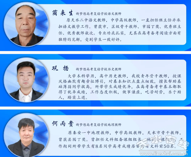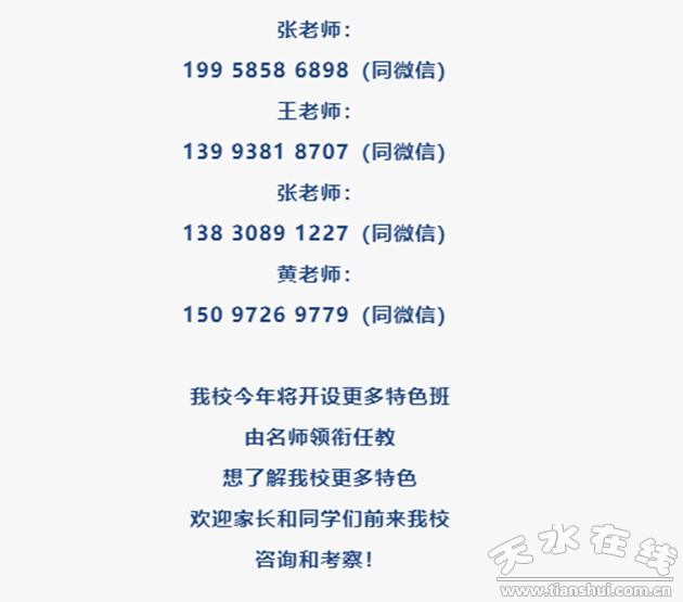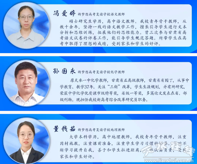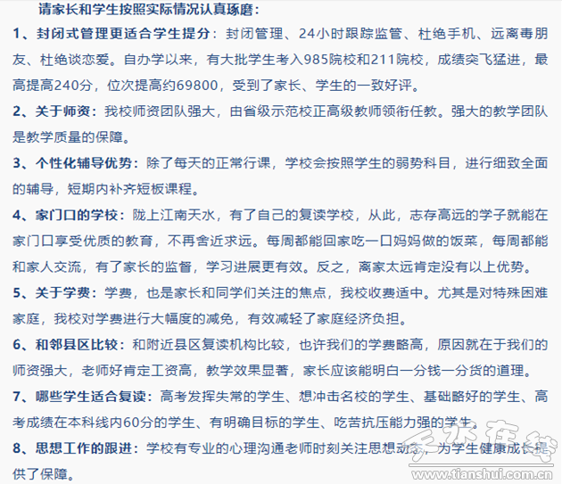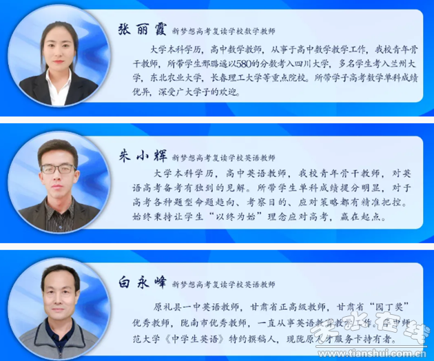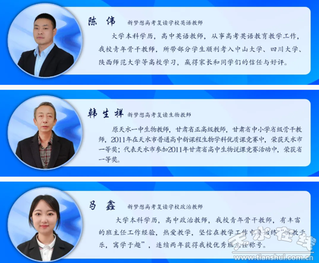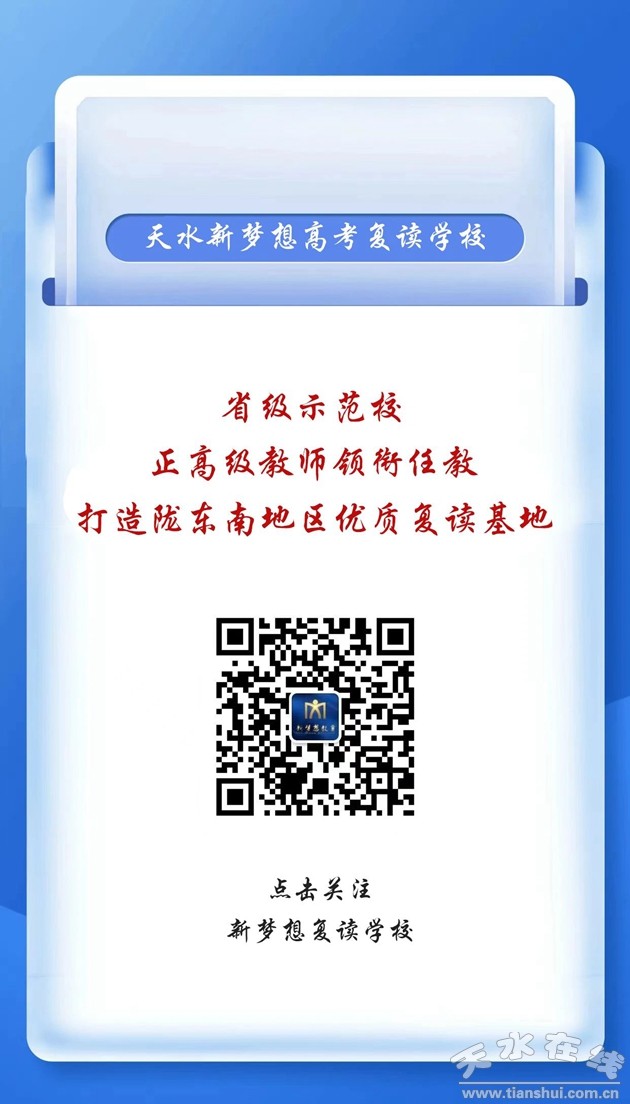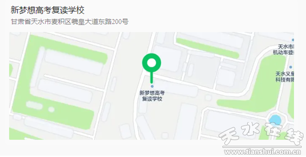 新夢想高考復(fù)讀學(xué)校是經(jīng)教育局審批,具有合法辦學(xué)資質(zhì)的天水地區(qū)第一所全封閉式高考復(fù)讀學(xué)校,學(xué)校位于天水市麥積區(qū)高鐵南站向西1.2公里處,交通便利,環(huán)境優(yōu)雅,設(shè)備齊全。