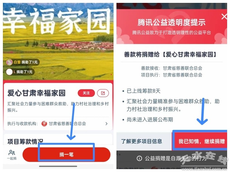 2、通過(guò)微信公眾號(hào)進(jìn)行捐贈(zèng),并進(jìn)行備注:善行天水;